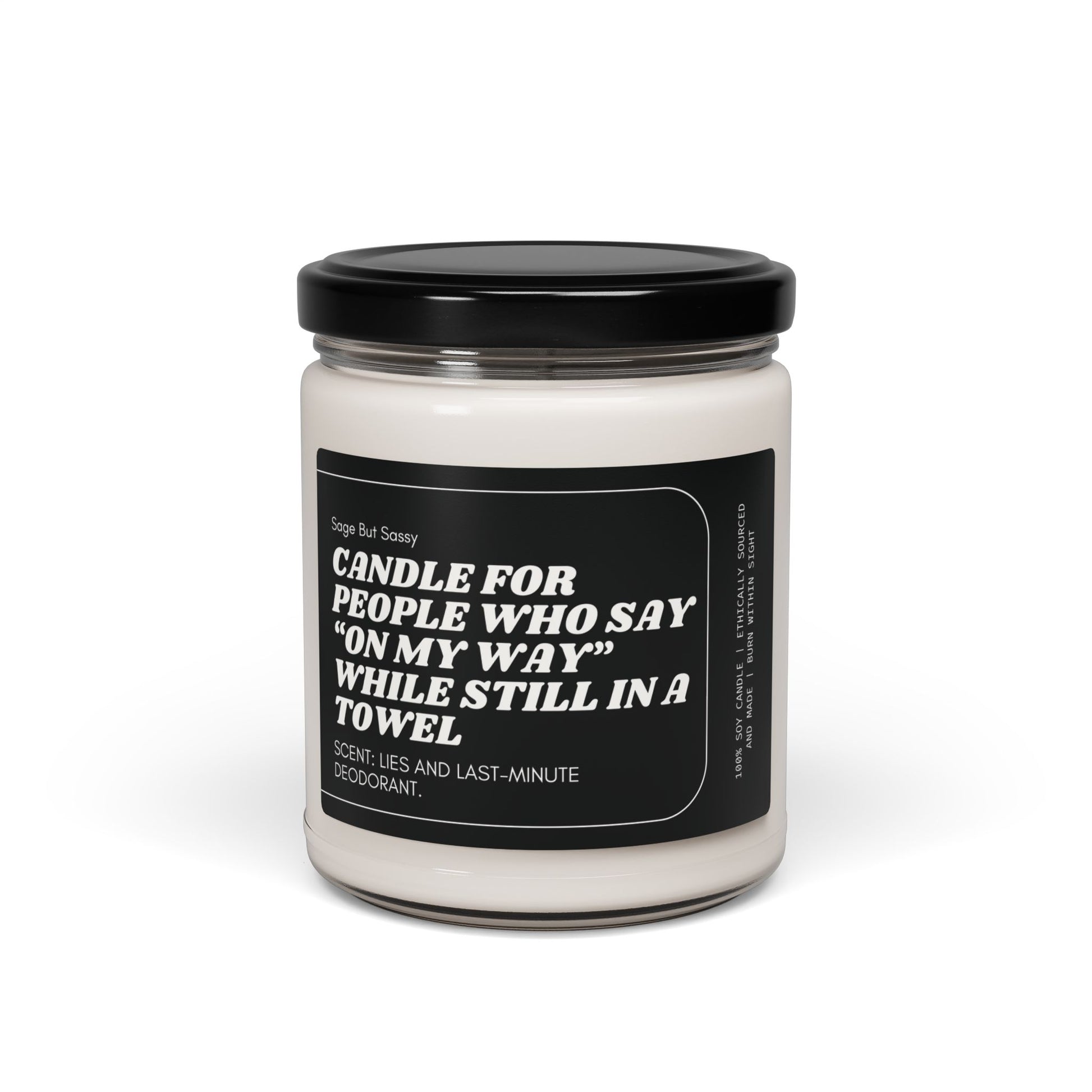 A scented candle perfect for gifting to those who are always running late. This candle gives off a cozy and inviting vibe, ideal for creating a relaxing atmosphere at home. Relevant for birthdays, holidays, housewarming gifts, and self-care occasions.