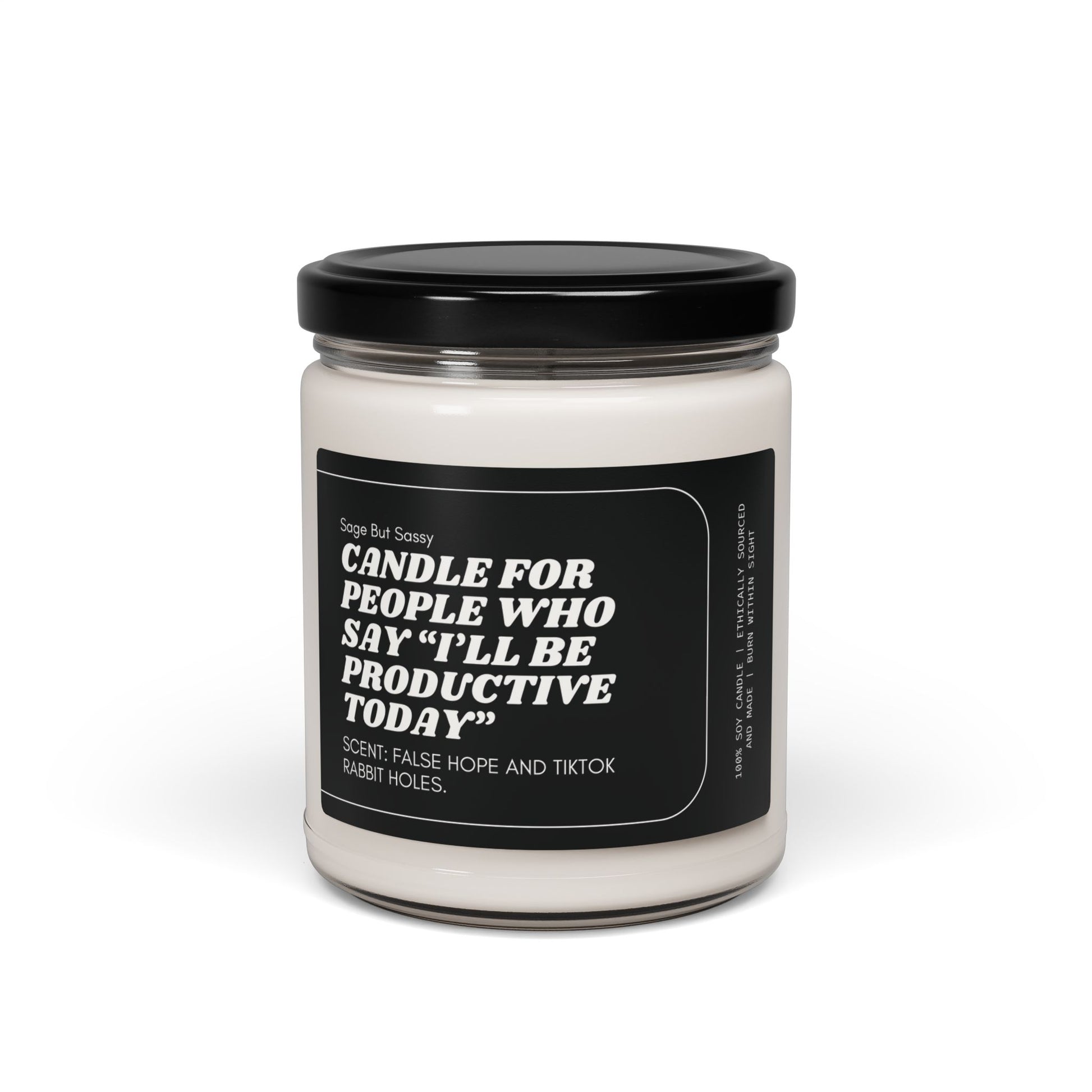 Text: Candle for people who say "I'll be productive today" when it's very much not (Scent: False hope and TikTok rabbit holes).